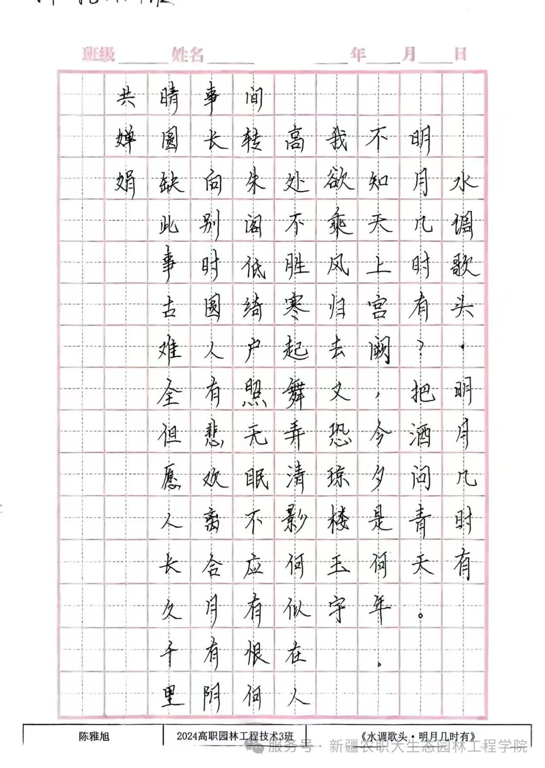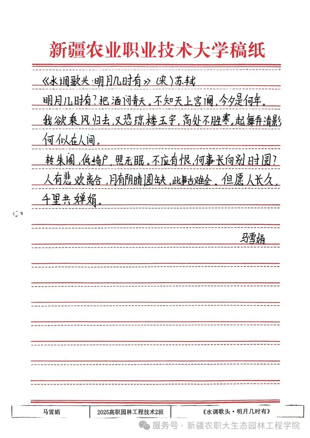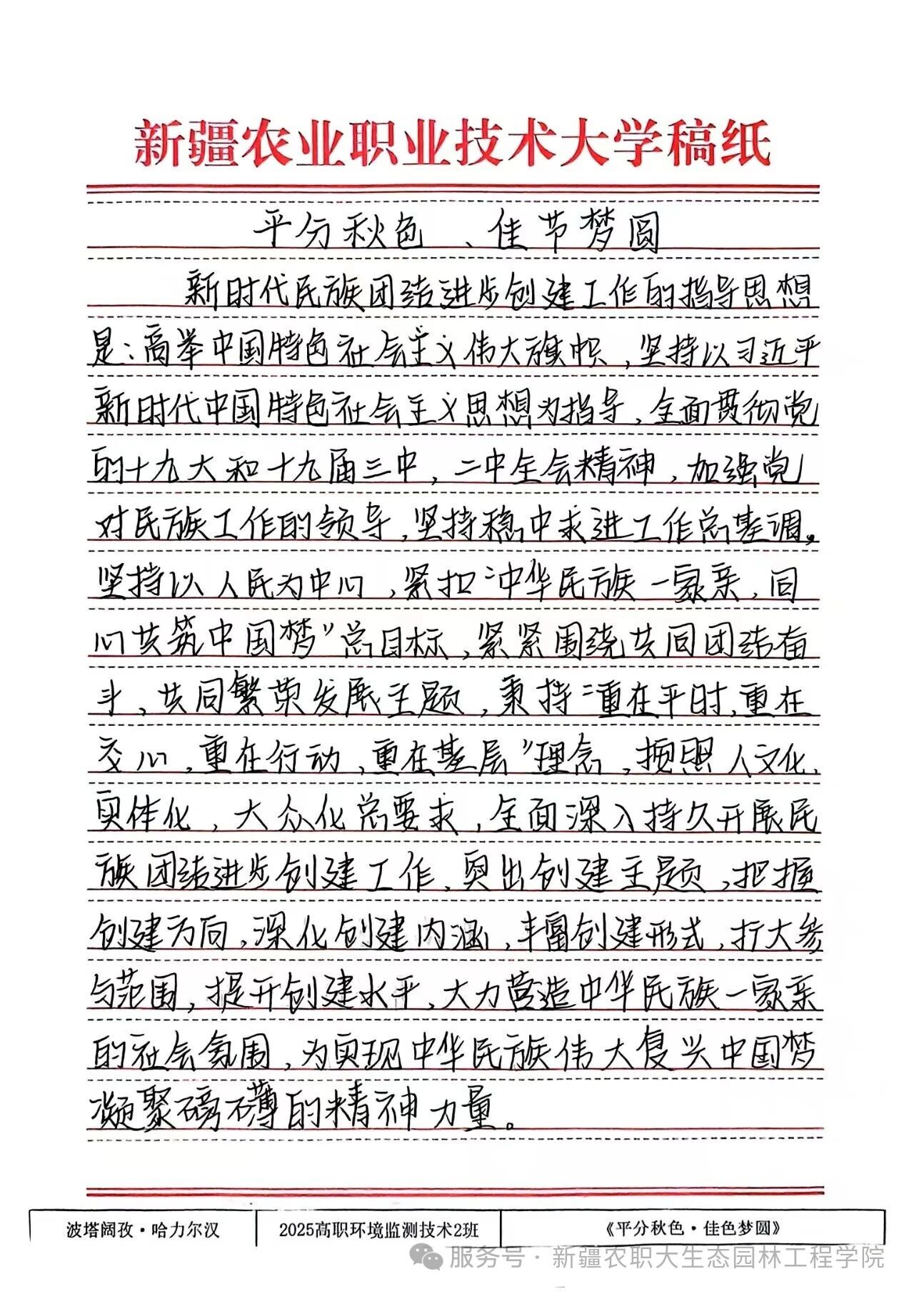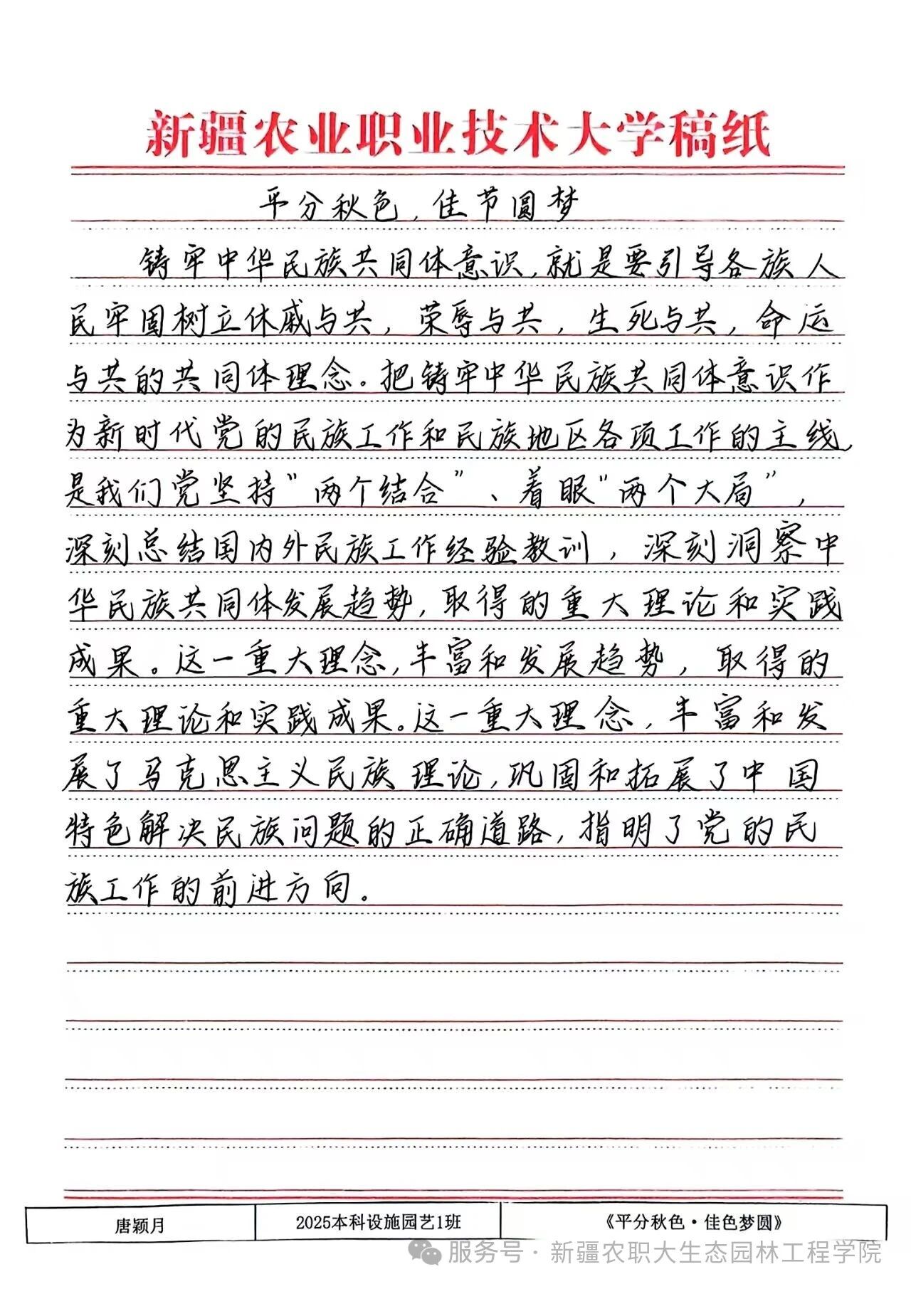 值中秋、国庆双节同庆,新疆维吾尔自治区成立 70 周年之际,为弘扬中华优秀传统文化,厚植文化自信与爱国情怀,营造浓厚校园文化氛围,提升学生汉字书写能力与艺术鉴赏水平,培养耐心、专注的学习品质,生态园林工程学院书法协会特策划“平分秋色 佳节梦圆”硬笔书法比赛,为广大热爱书法的学生提供展示才华、交流学习的平台。